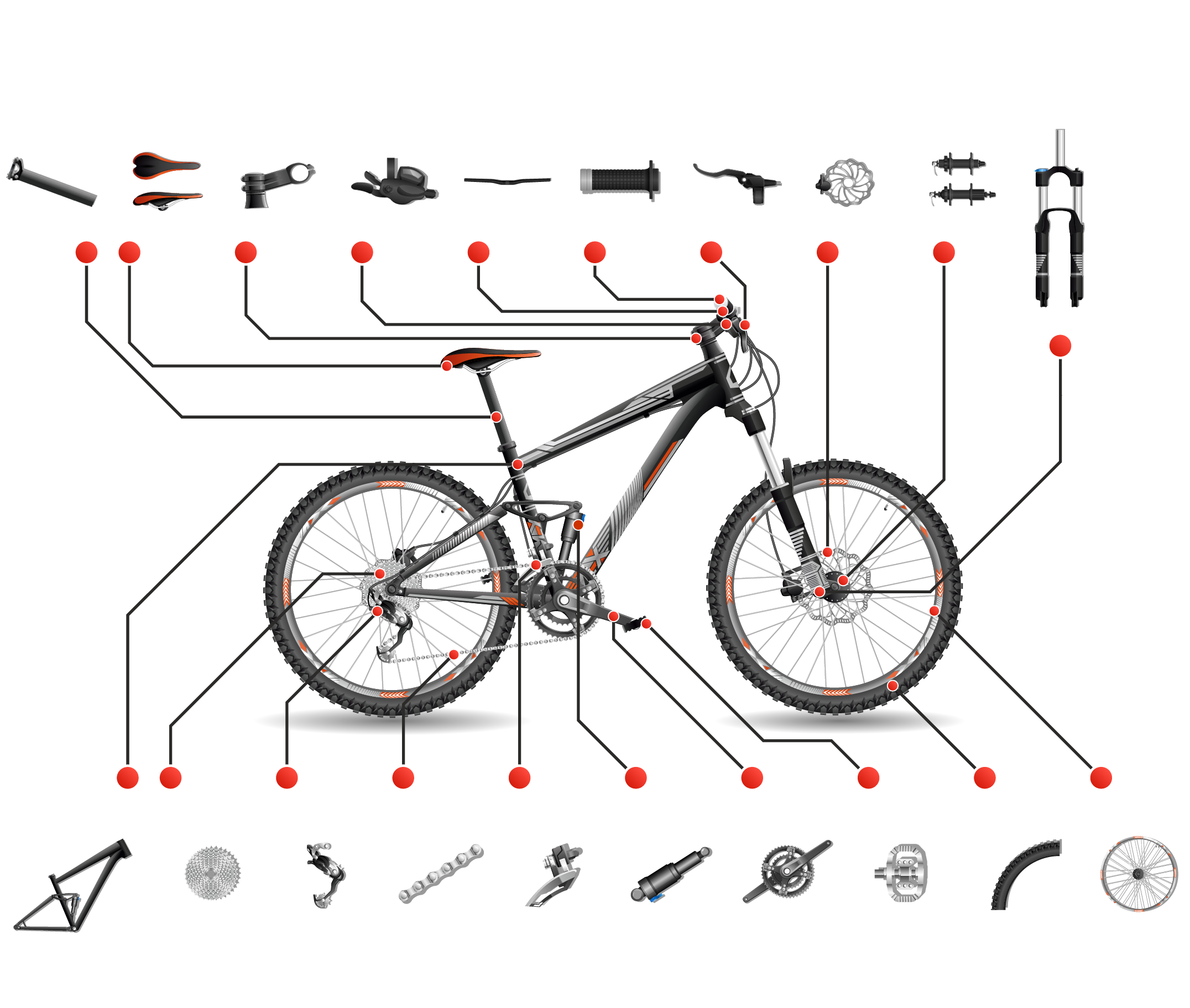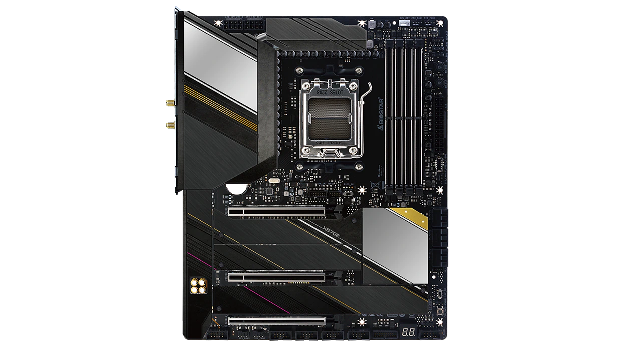 A large printed circuit board with numerous wires and various microchips, components, sockets, ports, slots, headers, and connectors.